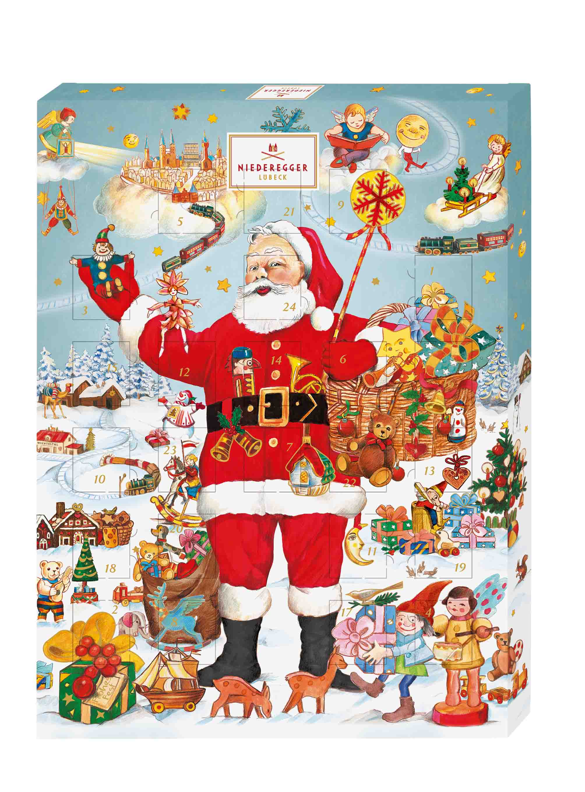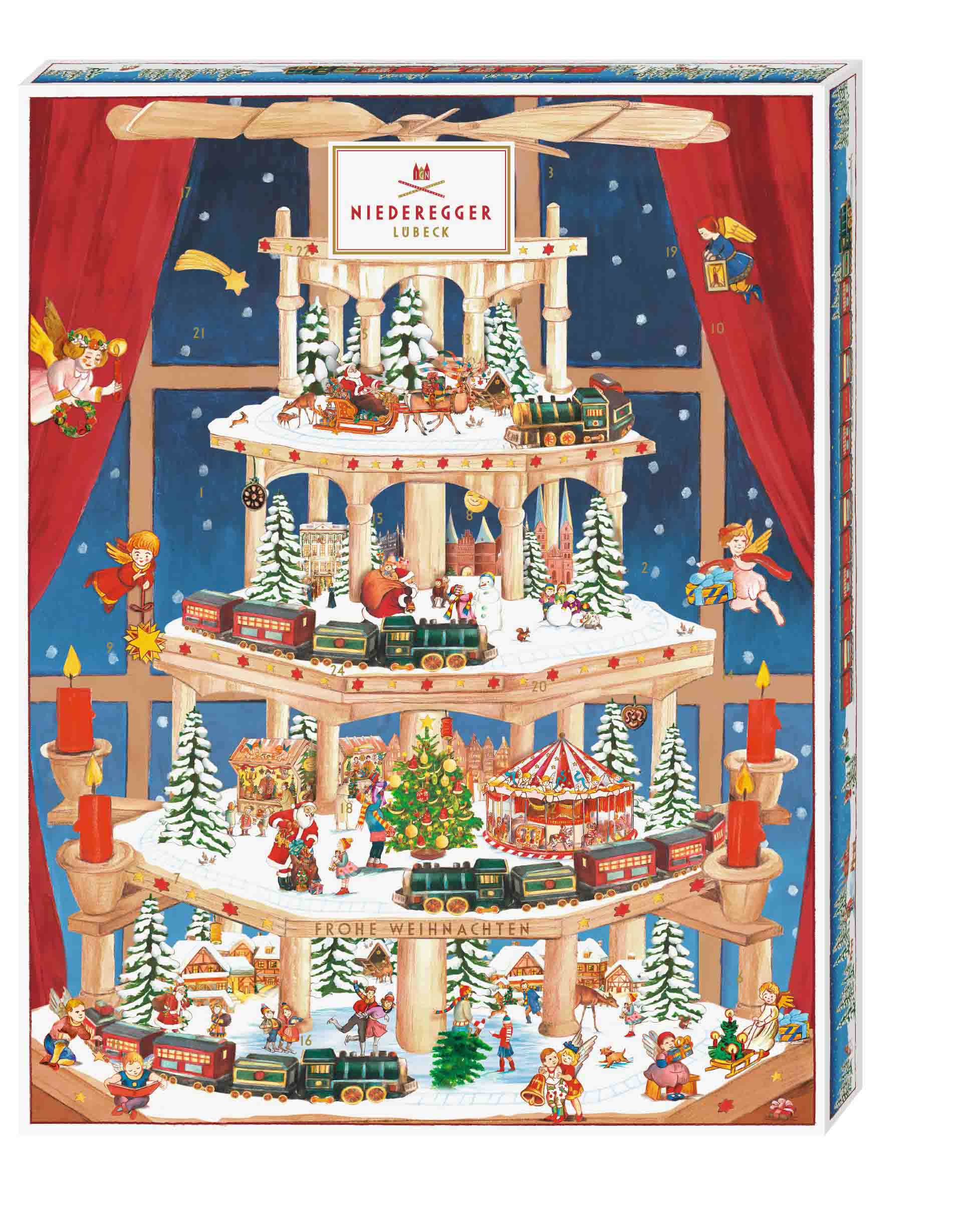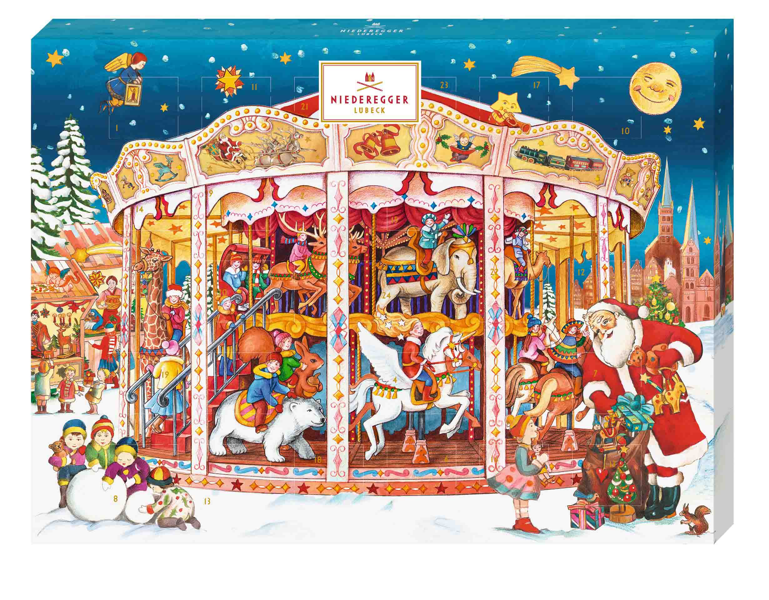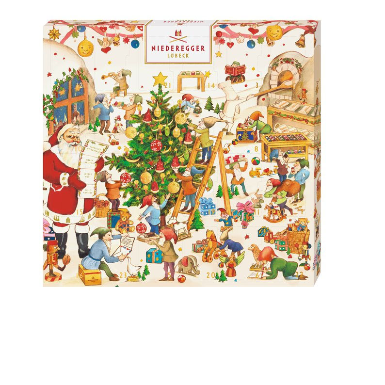 A highlight of their holiday collection is the variety of Advent calendars. These typically feature 24 individually wrapped marzipan chocolates hidden behind highly illustrated doors. Designs range from classic Christmas scenes to themed editions like carousel or pyramid calendars, combining visual appeal with daily treats.